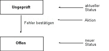 Name des nächsten Status im Workflow, wenn mit einem Fehler diese Aktion durchgeführt wird. Wird beispielsweise im Standard-Workflow ein Fehler mit dem Status Ungeprüft als Fehler bestätigt, weist Issue Manager ihm den nächsten Status zu (Offen ). Das folgende Workflow-Diagramm zeigt diesen Vorgang: