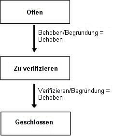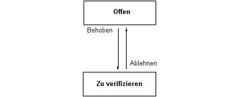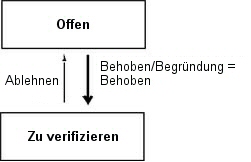Wird die "Behebung" jedoch abgelehnt, geht der Fehler zurück an die Entwicklungsabteilung (Offen), und die Begründung Behoben wird gelöscht, da sie nicht mehr zutrifft.