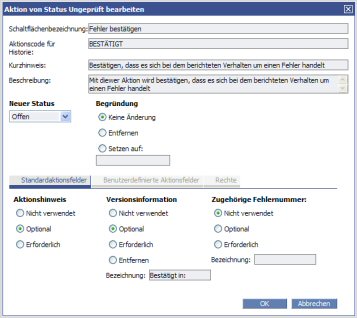 Aktionseigenschaften werden im Dialogfeld Aktion von Status bearbeiten festgelegt (Konfiguration/Workflows).