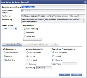 Mit Versionsinformation können Sie im Aktionsdialogfeld ein Listenfeld anzeigen lassen, aus dem der Benutzer die Version wählen kann, für die die Aktion durchgeführt wird. Die vom Benutzer gewählte Version wird auch in einem der automatischen Felder auf der Seite Fehlerdetails angezeigt. Die Information ist besonders für bestimmte Aktionen hilfreich (z. B. beim Bestätigen, Beheben und Verifizieren von Fehlern). Bei Aktionen, die den aktuellen Status nicht ändern, hat sie wenig Sinn.