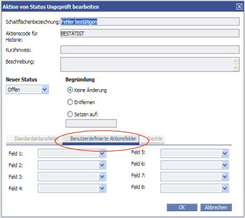 Im Register Benutzerdefinierte Aktionsfelder des Dialogfeldes Neue Aktion für Status können Sie dem Aktionsdialogfeld einer bestimmten Aktion Felder hinzufügen.