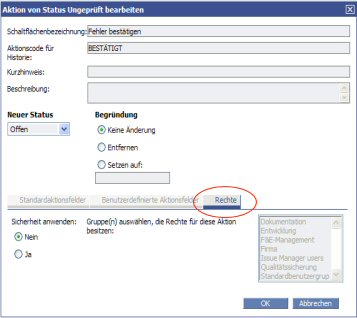 Im Register Rechte können Sie Sicherheitsstufen für bestimmte Aktionen festlegen, die nur von bestimmten Benutzergruppen durchgeführt werden dürfen.