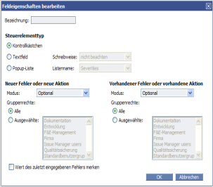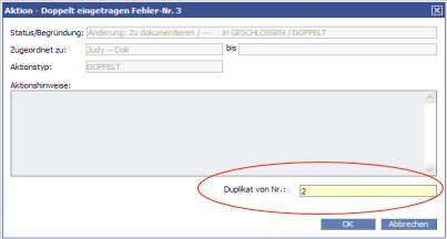 Mit Hilfe des Feldes Zugehörige Fehlernummer können Sie im Aktionsdialogfeld ein Textfeld platzieren, in dem der Benutzer die Nummer eines verwandten Fehlers oder eines Fehlerduplikats eingeben kann. Diese Information ist hilfreich, wenn der Benutzer die Aktion Doppelt eingetragen im Fehler-Workflow oder die Aktion Bereits fertig im Erweiterungs-Workflow durchführt.