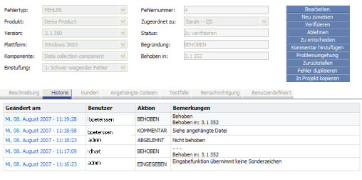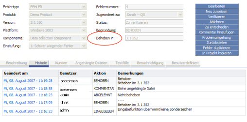 Die vom Benutzer im Aktionsdialogfeld angegebene Fehlernummer wird auch im Feld Bemerkungen des Registers Historie der Seite Fehlerdetails angezeigt. Angenommen, ein Benutzer führt die Aktion Doppelt eingetragen für Fehler-Nr. 8 durch, gibt Fehler-Nr. 6 als Duplikat an und klickt auf OK . Wenn die Seite Fehlerdetails wieder angezeigt wird, enthält das Feld Bemerkungen den Satz (Verwandt mit Fehlernummer n), wobei n der Wert des Feldes Duplikat von Nr. ist. Wenn das Feld Duplikat von Nr. optional ist und vom Benutzer nicht ausgefüllt wird, zeigt das Feld Bemerkungen den Wert des Feldes Aktionshinweise an.