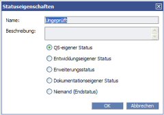 Wählen Sie einen Statuseigentümer aus, indem Sie die entsprechende Optionsschaltfläche aktivieren: QS-eigener Status, Entwicklungseigener Status, Dokumentationseigener Status, Erweiterungsstatus oder Niemand (Endstatus). Das Konzept des Statuseigentümers wird in "Statuseigentümer" beschrieben.