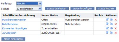 In den Standard-Workflows können die Namen, die Eigentümer, und die Beschreibungen von Statuswerten geändert werden. Sie können alle Statuswerte auf einmal eingeben oder ändern und dann alle Aktionen für die einzelnen Statuswerte hinzufügen. Sie können auch einen Status zusammen mit all seinen Aktionen eingeben und dann mit dem nächsten Status fortfahren.