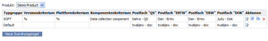 Es empfiehlt sich, die Arbeitsabläufe in Ihrem Unternehmen zu analysieren. Untersuchen Sie die Liste der Produkte, Versionen und Plattformen, und überprüfen Sie jede Komponente anhand dieser Liste. Stellen Sie sich Fragen wie die folgende: "Wer (d. h. welches Postfach) ist für diese Komponente in dieser Version auf dieser Plattform verantwortlich für die einzelnen Aktionen (d. h. Überprüfen, Bereinigen usw.)?". Dann definieren Sie so viele Regeln, wie für die verschiedenen Kombinationen aus den vier Kriterien Produkt, Version, Plattform und Komponente erforderlich sind.