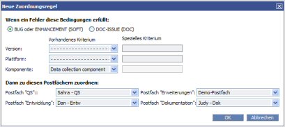 In den Feldern Version und Plattform dient das Zeichen % (Prozent) als Platzhalter für beliebige andere Zeichen. Wenn Sie in alle drei Felder nur das Prozentzeichen eingeben, entspricht dies der Standardzuordnung. In diesem Fall würden alle Fehler unabhängig von ihrer Version, Plattform und Komponente den vier Postfächern zugeordnet.