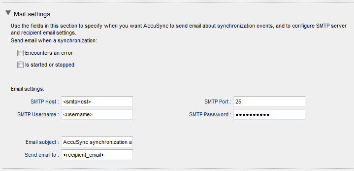 Email configuration – If you want, you can configure AccuSync to email AccuSync Configuration status and error reports to users you specify. See Email Notification for AccuSync Events for more information.