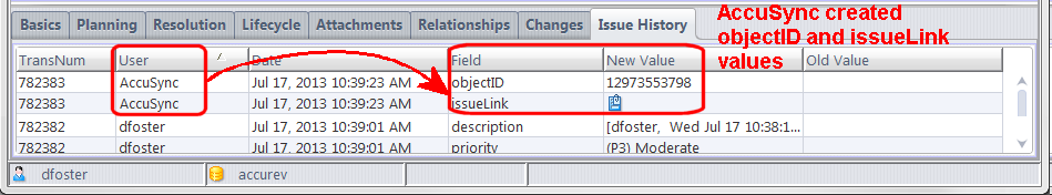 and only this user -- when specifying the connection settings in your AccuSync Configurations. The AccuSync user name you specify is the user AccuWork associates with changes made by AccuSync during synchronization. When a record is updated with changes resulting from synchronization (as when an objectID or issueLink value is created, for example), the AccuSync user name appears in the User column in the Issue History tab for that change, as shown here:
