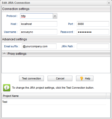 4. Click the Test Connection button.When the connection succeeds, new panels appear on the Edit Configuration dialog box. Fields on this panel vary based on your ITS. See Testing the ITS Connection for more information.Note for JIRA users: If the connection to JIRA does not succeed, make sure that the JIRA plugin for AccuSync was installed and that JIRA has been configured to accept remote API calls. See Step 1: Configure JIRA for AccuSync for more information.Note for Rally Users: You cannot select a Task project without also selecting the corresponding Defect or Story project.