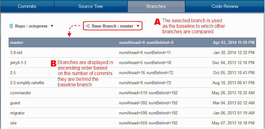 The branch you choose as the baseline is moved to the top of the page and highlighted. The other branches in the repository are displayed in ascending ordered by the number of commits they are behind the baseline branch (numBehind).