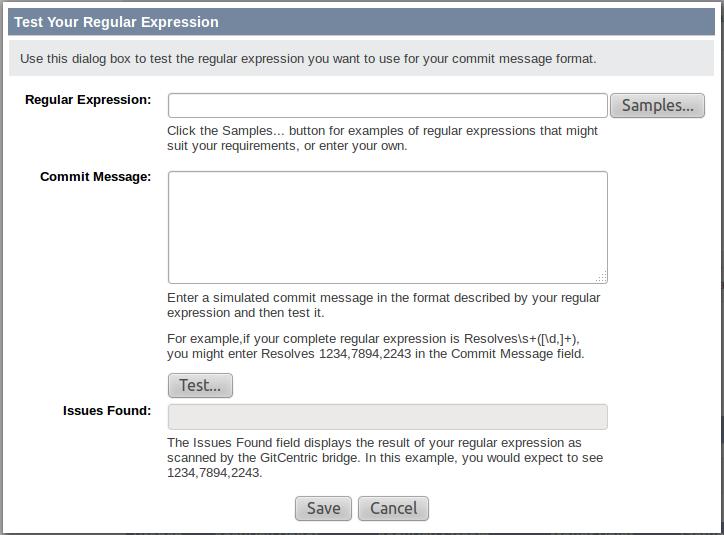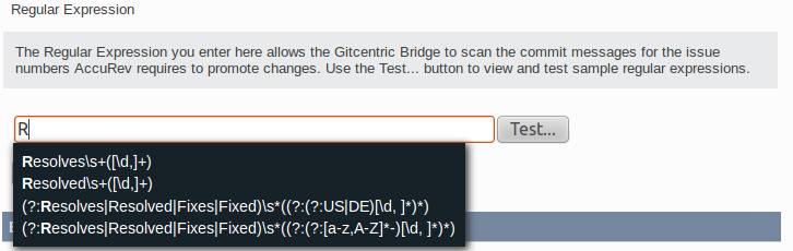 5. In the Regular Expression field, use a regular expression to specify the format of the commit message you require -- Resolves issue 1234, for example. You can accomplish this by either: