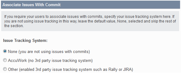 4. In the Issue Tracking System field, specify whether you are using AccuWork or a third-party issue tracking system.